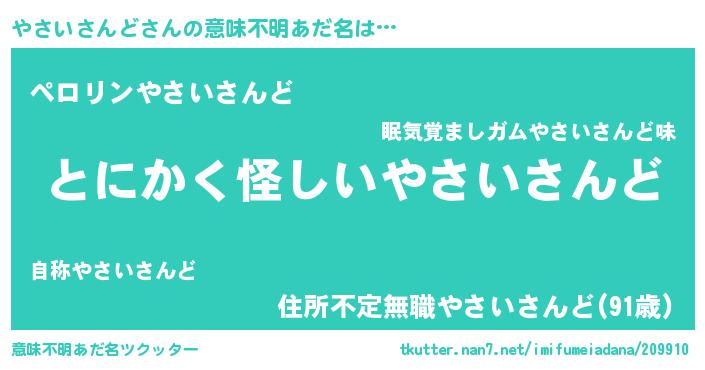 | 欧米人風あだ名 | 『ウサインやさいさんど』 |