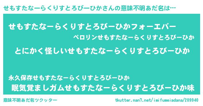 | 女子向けラノベタイトル風あだ名 | 『せもすたなーらくりすとろびーひかは平凡を望む』 |