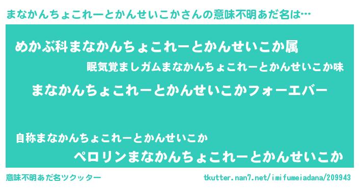 | 欧米人風あだ名 | 『まなかんちょこれーとかんせいこかクリステル』 |