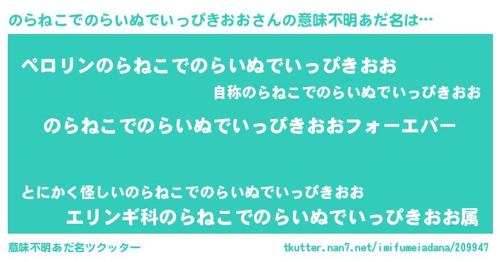 | ファンタジー風あだ名 | 『エターナルノラネコデノライヌデイッピキオオー』 |