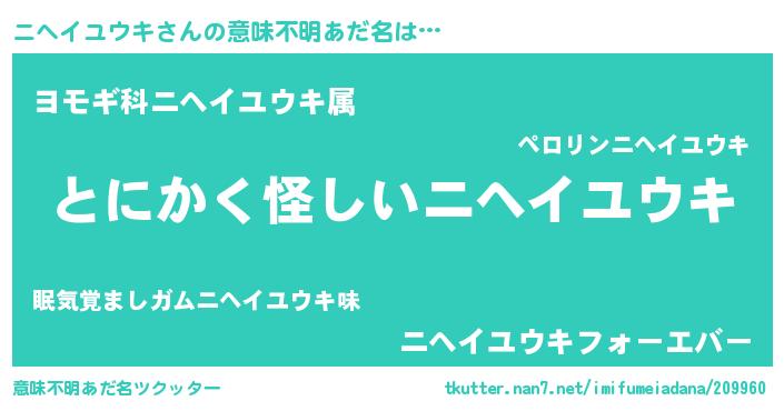 | ポケモン風あだ名 | 『ヒニヘイユウキ』『ニヘキング』 |