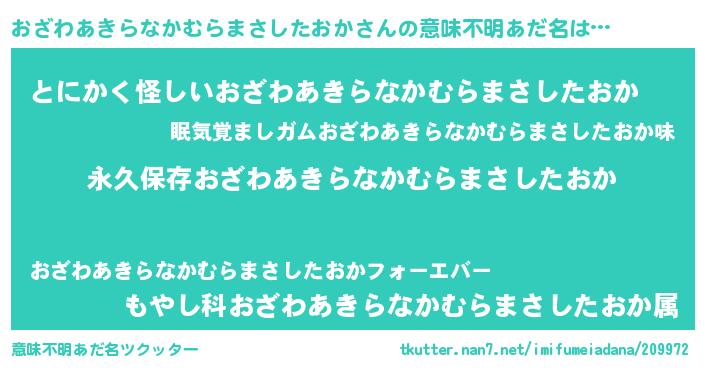 | 胡散臭い通販商品みたいなあだ名 | 『絶対に幸福をもたらす水素水…その名も「おざわあきらなかむらまさしたおか」』 |