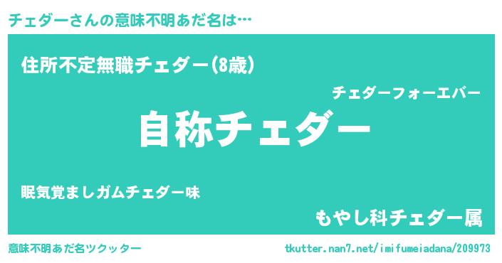 | 女子向けラノベタイトル風あだ名 | 『チェダーなんてお断りですっ。』 |