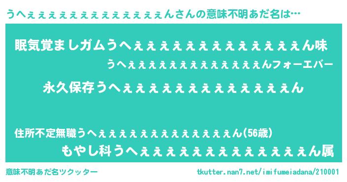| 胡散臭い通販商品みたいなあだ名 | 『来世でも幸せになれる水素水…その名も「うへぇぇぇぇぇぇぇぇぇぇぇぇぇん」』 |