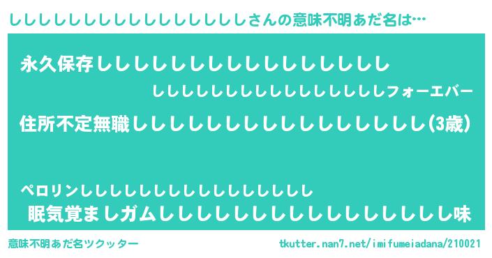 | 男性向けラノベタイトル風あだ名 | 『魔弾の王としししししししししししししししし』 |