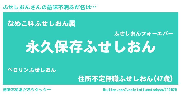 | 男性向けラノベタイトル風あだ名 | 『ふせしおんに滅ぼされるだけの簡単なお仕事です』 |