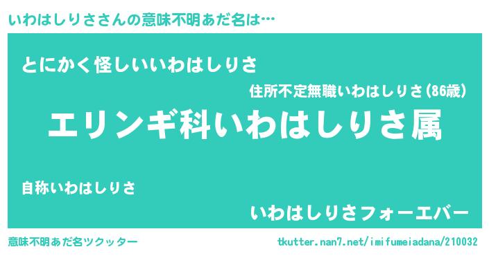 | 男性向けラノベタイトル風あだ名 | 『イワハシリサスレイヤー』 |