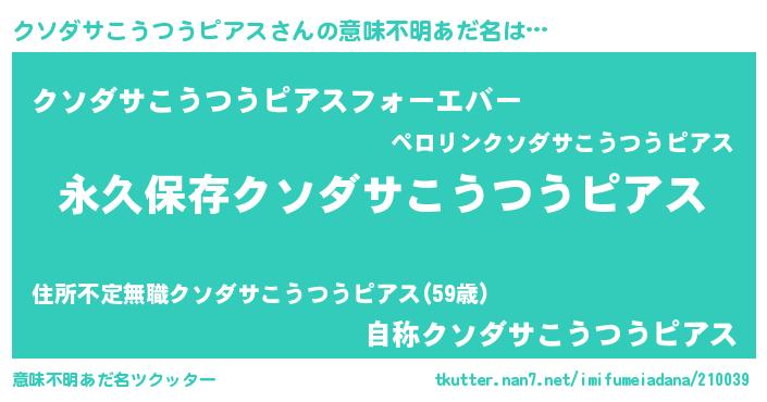 | 男性向けラノベタイトル風あだ名 | 『クソダサこうつうピアスという概念が存在しない退屈な世界 』 |