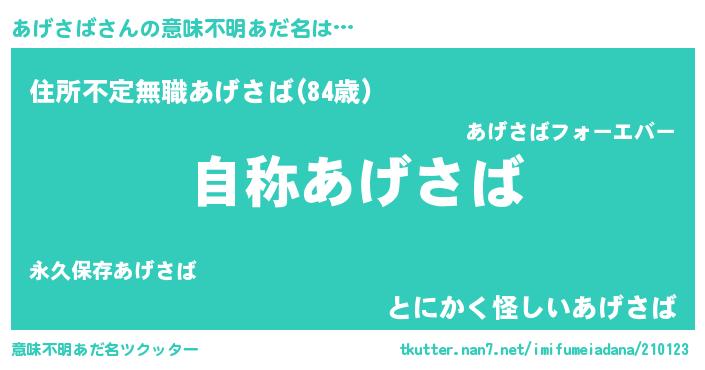 | 欧米人風あだ名 | 『アンジェラ・あげさば』 |