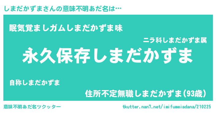 | 男性向けラノベタイトル風あだ名 | 『しまだかずまという概念が存在しない退屈な世界 』 |