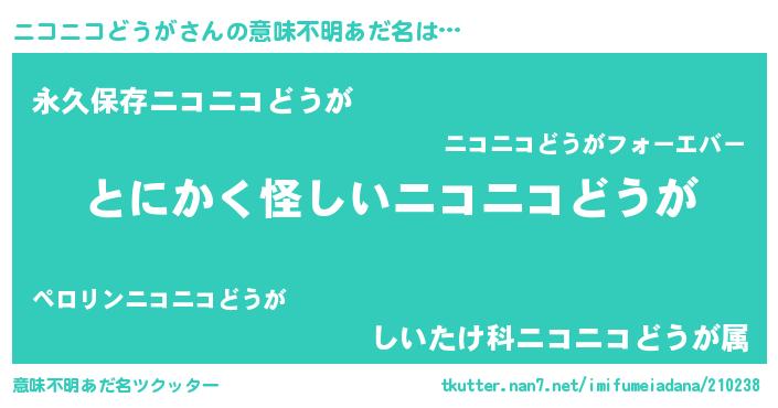 | 男性向けラノベタイトル風あだ名 | 『ニコニコどうがの嫁は女の子じゃないと思った?』 |