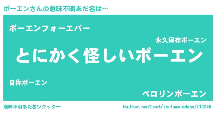 | 女子向けラノベタイトル風あだ名 | 『ボーエンの卵を拾いまして』 |