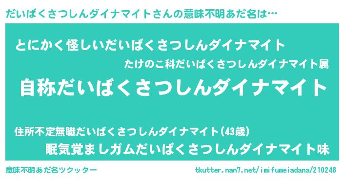 | 女子向けラノベタイトル風あだ名 | 『だいばくさつしんダイナマイトなんてお断りですっ。』 |
