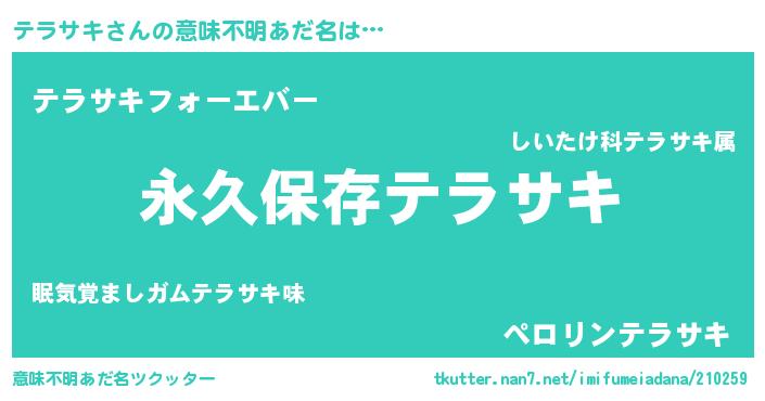 | 男性向けラノベタイトル風あだ名 | 『テラサキという概念が存在しない退屈な世界 』 |