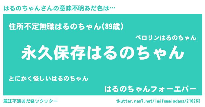| 男性向けラノベタイトル風あだ名 | 『はるのちゃんに滅ぼされるだけの簡単なお仕事です』 |