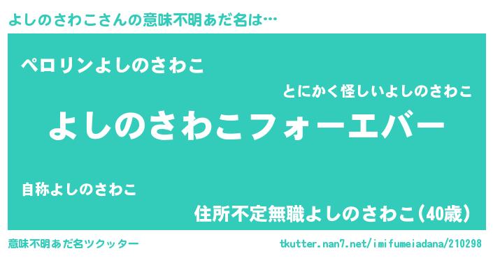 | 男性向けラノベタイトル風あだ名 | 『やはりよしのさわこの青春ラブコメはまちがっている 』 |