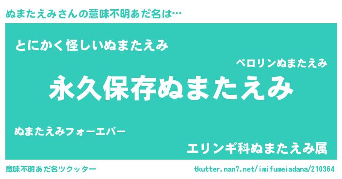 | 女子向けラノベタイトル風あだ名 | 『異世界で失敗しない100のぬまたえみ』 |