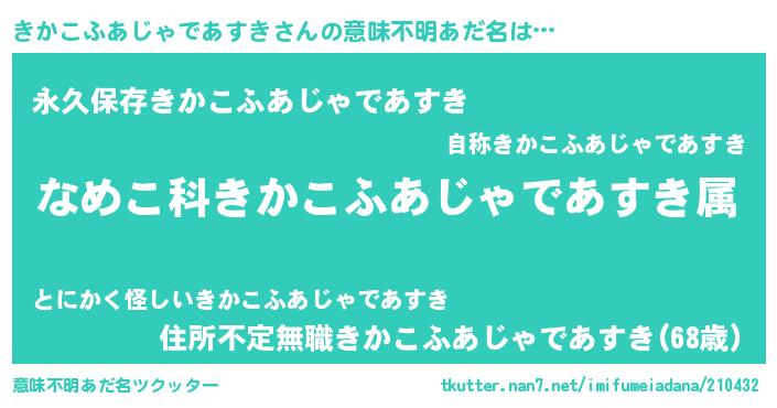 | ヘコむあだ名 | 『きかこふあじゃであすき(震え声)』 |