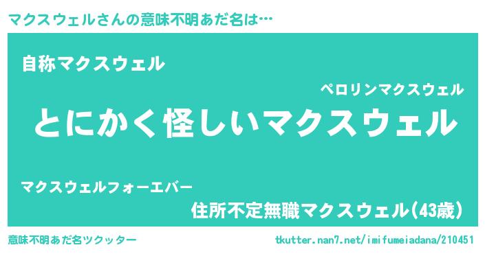 | 男性向けラノベタイトル風あだ名 | 『マクスウェルの嫁は女の子じゃないと思った?』 |