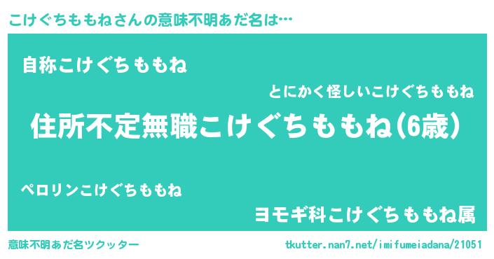 | 伝説のあだ名 | 『孤高の魔法使いこけぐちももね』 |