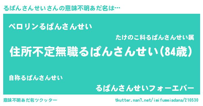 | 男性向けラノベタイトル風あだ名 | 『この素晴らしい世界にるぱんさんせいを!』 |