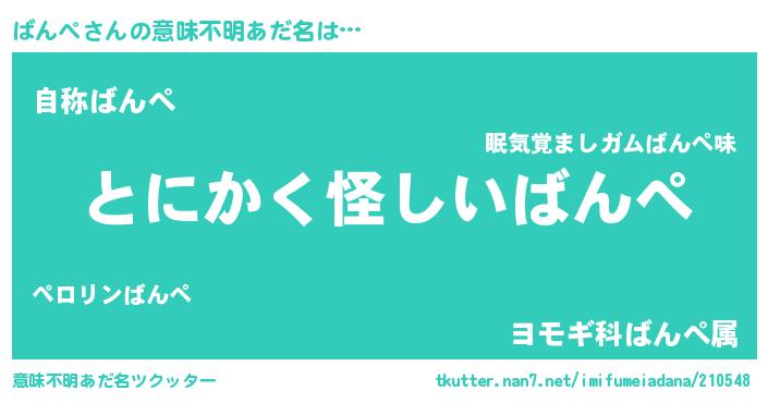 | 女子向けラノベタイトル風あだ名 | 『ばんぺの卵を拾いまして』『闇のばんぺ』 |