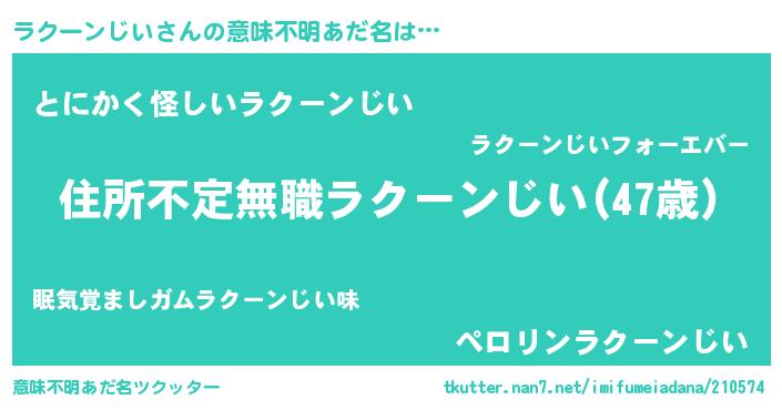 | 男性向けラノベタイトル風あだ名 | 『この素晴らしい世界にラクーンじいを!』 |