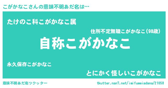 | 男性向けラノベタイトル風あだ名 | 『Re:こがかなこから始める異世界生活』 |