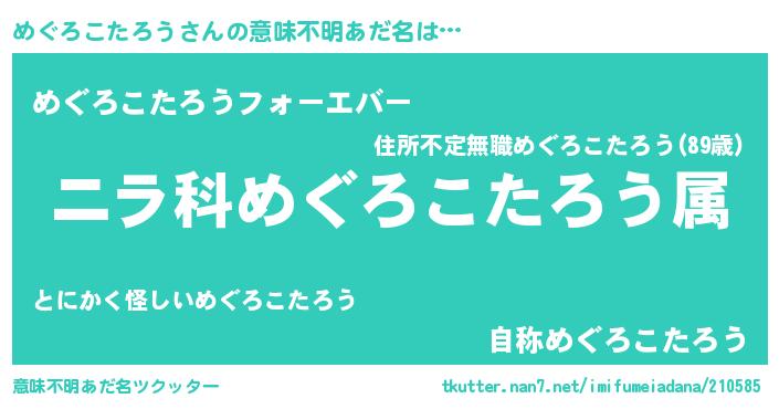 | 男性向けラノベタイトル風あだ名 | 『めぐろこたろう~年齢イコール彼女いない歴の魔法使い~』 |
