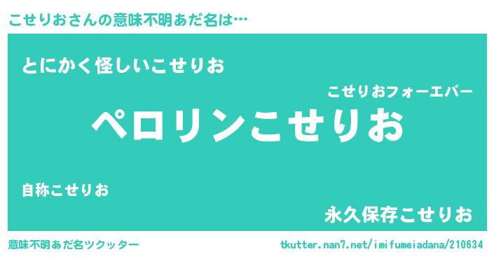 | 男性向けラノベタイトル風あだ名 | 『うちのこせりおが世界を掌握している!』 |