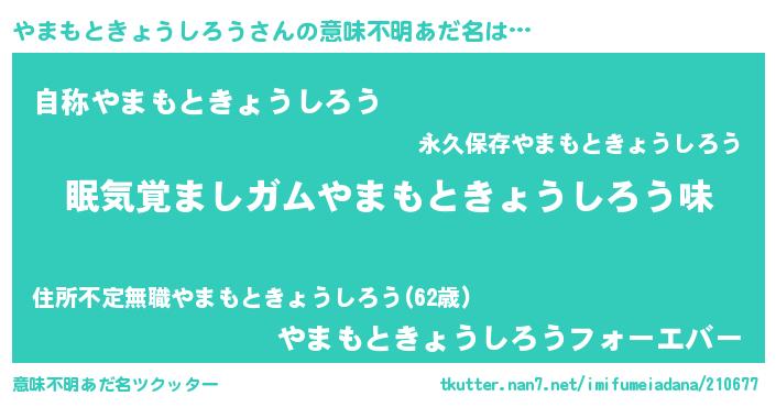 | 男性向けラノベタイトル風あだ名 | 『ノーゲーム・ノーヤマモトキョウシロウ』 |