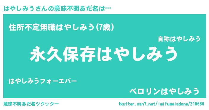 | 胡散臭い通販商品みたいなあだ名 | 『絶対に幸福をもたらす水素水…その名も「はやしみう」』 |