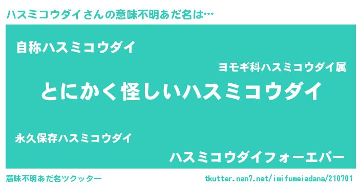 | ポケモン風あだ名 | 『ヒハスミコウダイ』『ハスセウス』 |