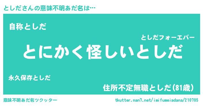| 男性向けラノベタイトル風あだ名 | 『としだの嫁は女の子じゃないと思った?』 |