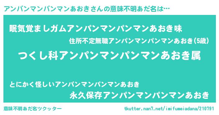 | 男性向けラノベタイトル風あだ名 | 『アンパンマンパンマンあおき~年齢イコール彼女いない歴の魔法使い~』 |