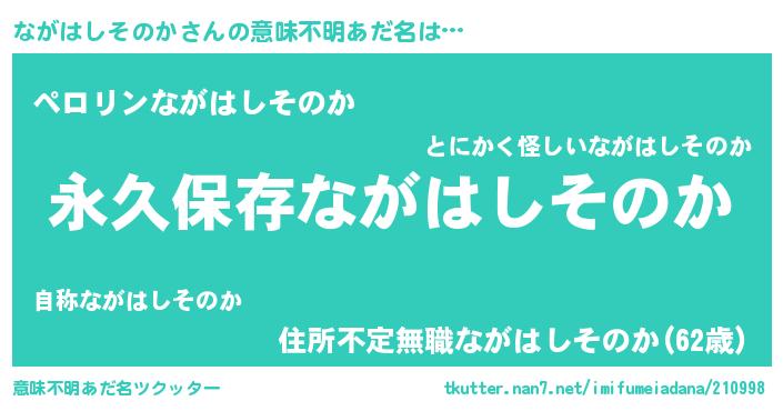 | 胡散臭い通販商品みたいなあだ名 | 『来世でも幸せになれる健康食品…その名も「ながはしそのか」』 |