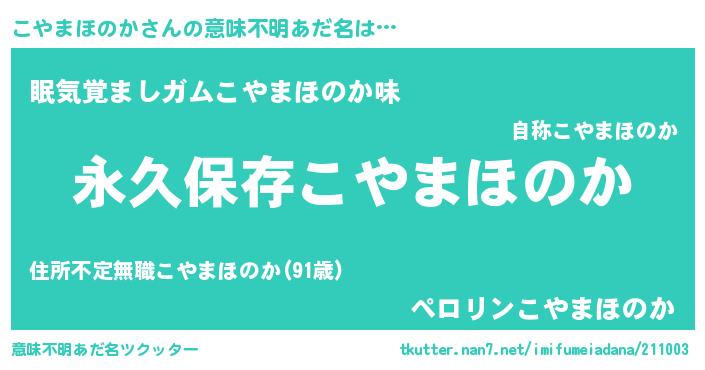 | 女子向けラノベタイトル風あだ名 | 『異世界で失敗しない100のこやまほのか』 |