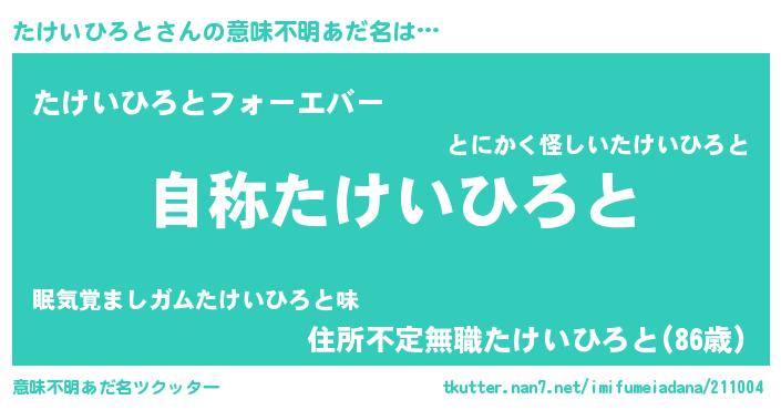 | 男性向けラノベタイトル風あだ名 | 『Re:たけいひろとから始める異世界生活』 |