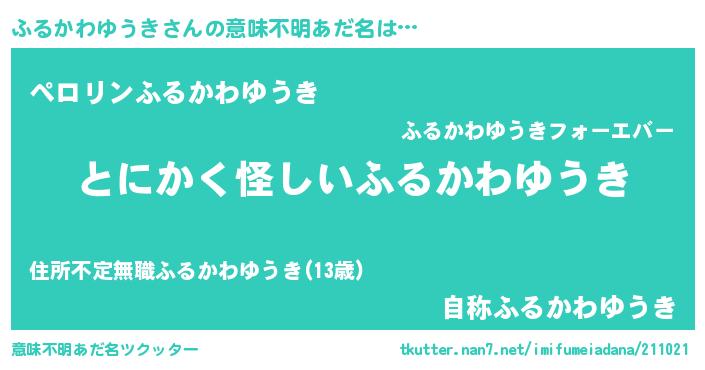 | 男性向けラノベタイトル風あだ名 | 『ふるかわゆうきの嫁は女の子じゃないと思った?』 |