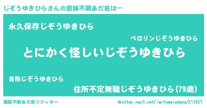 | 男性向けラノベタイトル風あだ名 | 『じぞうゆきひらの嫁は女の子じゃないと思った?』 |