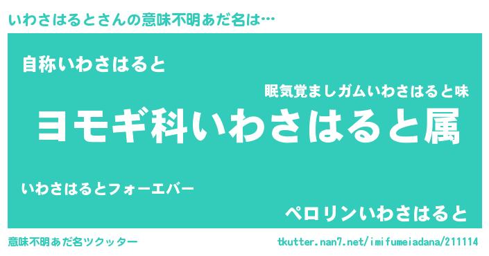 | 男性向けラノベタイトル風あだ名 | 『いわさはると~年齢イコール彼女いない歴の魔法使い~』 |