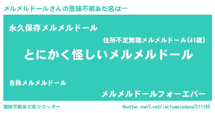 | 男性向けラノベタイトル風あだ名 | 『メルメルドールの嫁は女の子じゃないと思った?』 |