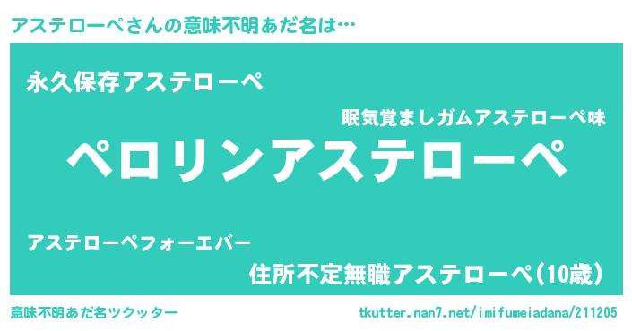 | ヒーロー風カッコイイあだ名 | 『スーパーアステローペ』『仮面アスダー』 |