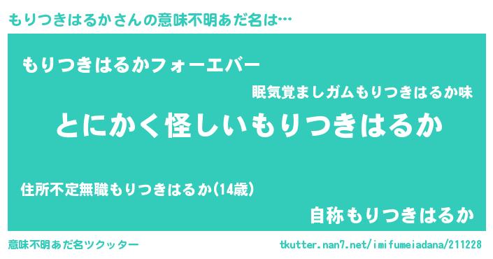 | 男性向けラノベタイトル風あだ名 | 『もりつきはるかの嫁は女の子じゃないと思った?』 |