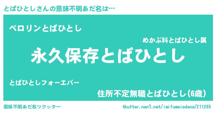| 胡散臭い通販商品みたいなあだ名 | 『絶対に幸福をもたらす水素水…その名も「とばひとし」』 |