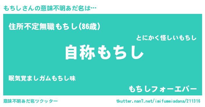 | 男性向けラノベタイトル風あだ名 | 『もちしに滅ぼされるだけの簡単なお仕事です』 |