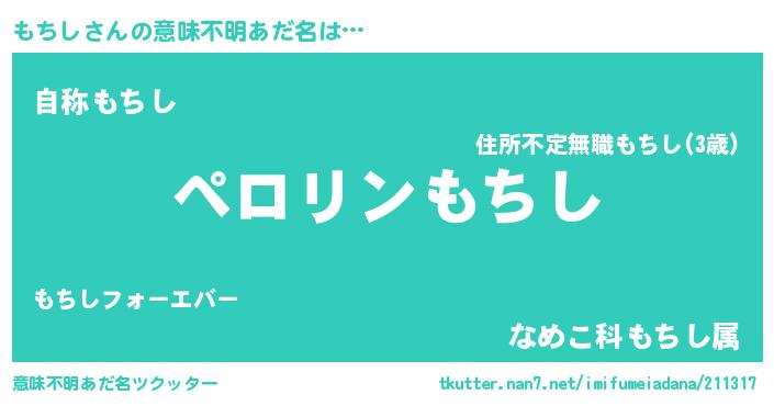 | 男性向けラノベタイトル風あだ名 | 『うちのもちしが世界を掌握している!』 |