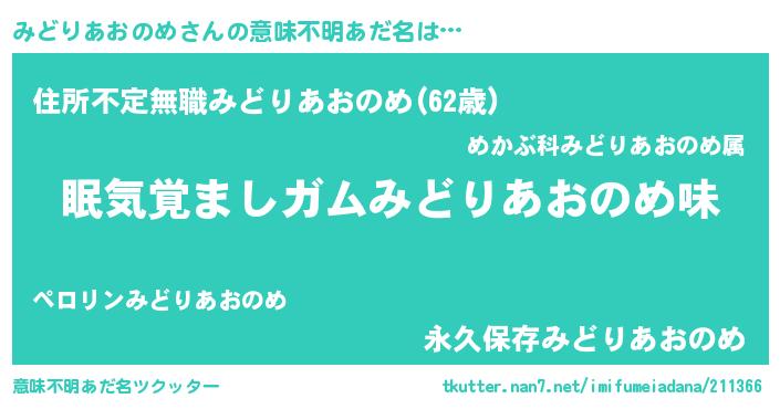 | 男性向けラノベタイトル風あだ名 | 『おまえをオタクにしてやるから、俺をみどりあおのめにしてくれ! 』 |