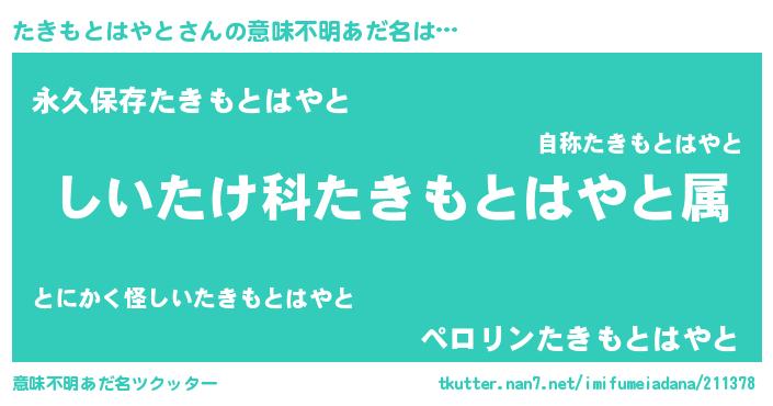 | 胡散臭い通販商品みたいなあだ名 | 『絶対に幸福をもたらす健康食品…その名も「たきもとはやと」』 |