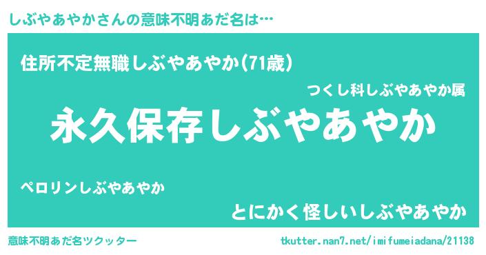 | 胡散臭い通販商品みたいなあだ名 | 『来世でも幸せになれる健康食品…その名も「しぶやあやか」』 |